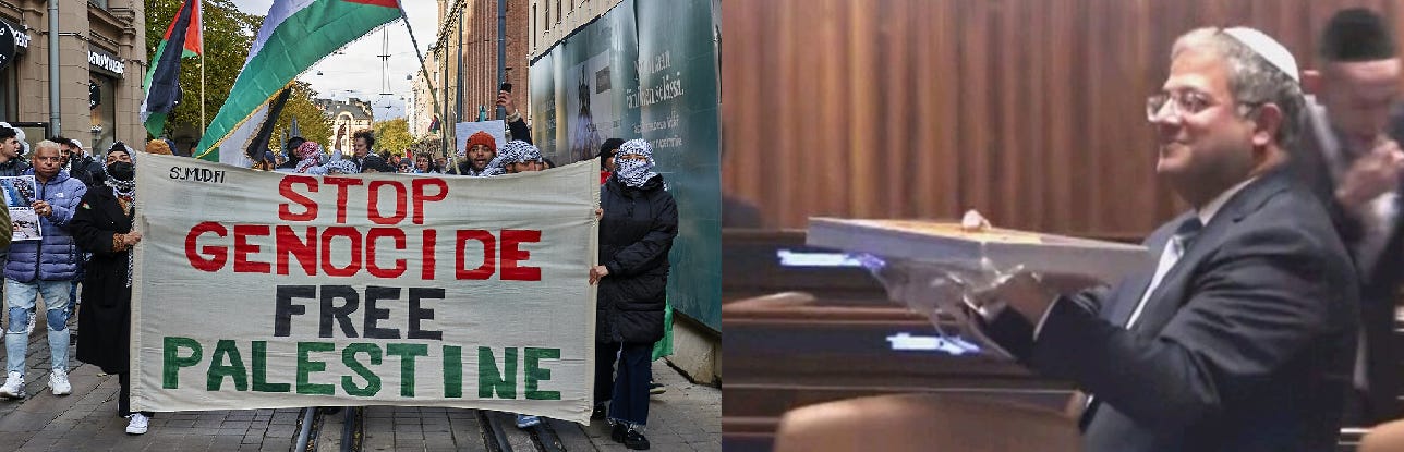 Now, these are movies. Thrillers. No one watches them believing they’re documentary realism or moral philosophy. They’re designed to entertain, to provide satisfaction, to let audiences experience catharsis about historical evils through fictional revenge scenarios. What makes them significant as cultural artifacts is their timing and their influence. These films appeared and became culturally prominent at the exact moment when this same moral worldview was migrating from fiction into political discourse about actual conflicts. The films were part of the emerging phenomenology of righteous sadism. In the immediate aftermath of the October 7th massacres in southern Israel, the public debate could have been formed (and indeed I heard it explicitly stated, in these terms) as: Who is the real Django Unchained, Hamas or Israel? The question is merely about who should be on the receiving end of limitless violence.